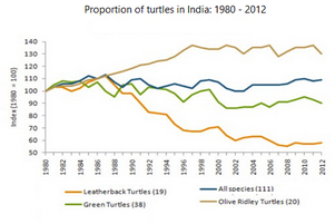 [Line Graph: The graph below gives information on the population of turtles in India from 1980 to 2012.]