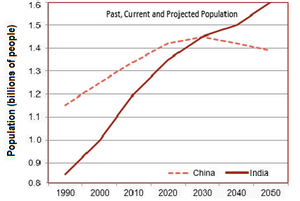 [Line Graph: The line graph shows the projected population growth of China and India.]