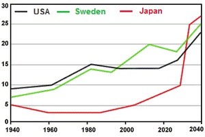 [Line Graph: The graph below shows the proportion of the population aged 65 and over between 1940 and 2040 in three different countries.]