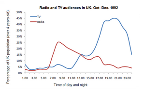 [Line Graph: The graph below shows radio and television audiences of United Kingdom throughout the day in the year 1992.]
