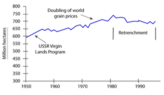 [Line Graph: The graph below shows the area of land from which grain was harvested. Write a report for a university lecturer describing the information in the graph.]
