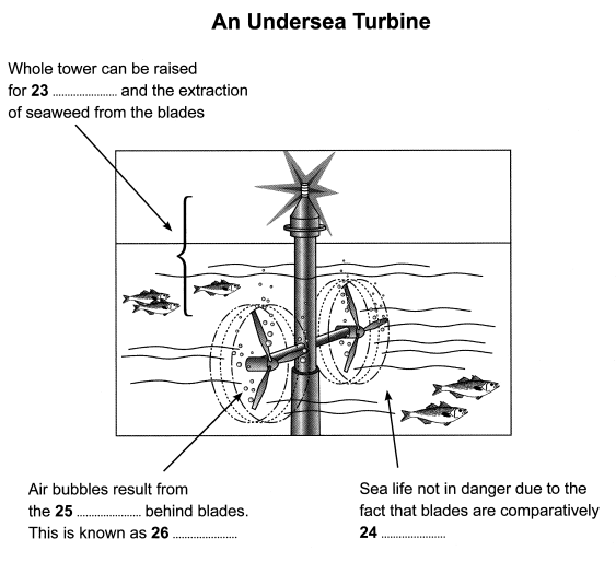 D. A marine turbine blade needs to be only one-third of the size of a wind generator to produce three times as much power. The blades will be about 20 metres in diameter so around 30 metres of water is required. Unlike wind power, there are unlikely to be environmental objections. Fish and other creatures are thought unlikely to be at risk from the relatively slow turning blades. Each turbine will be mounted on a tower which will connect to the national power supply grid via underwater cables. The towers will stick out of the water and be lit. to warn shipping, and also be designed to be lifted out of the water for maintenance and to clean seaweed from the blades.