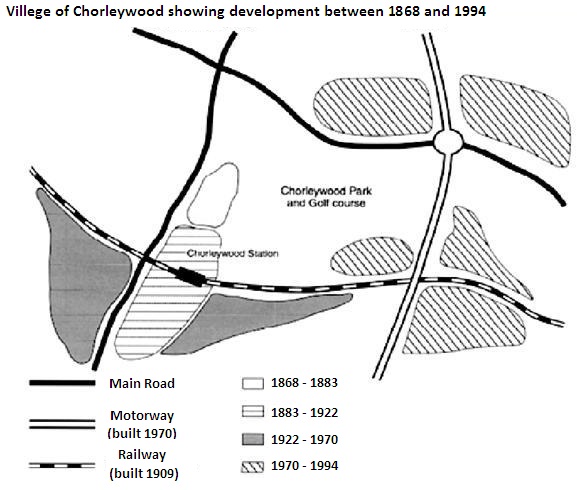 According to the diagram, the motor road was established in 1970 while the railway was built in 1909 in Chorleywood. Before 1900, only a portion of the village was developed and later (between 1883 and 1922) the station was built and some development works were finished. The area near the station was then improved and during the end of this construction, in 1970 to be precise, the motorway was completed. After 1970, the expansion process seemed accelerated and many areas of the village came under the renovation process. At the beginning of 20th century, the railway was built.
