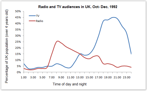 Graph Writing # 119 - Radio and television audiences of United Kingdom throughout the day