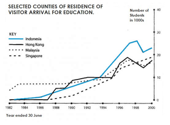 In 1982, more than 6 thousand Malay students lived in Australia while students from the three remaining countries were considerably fewer. The figure for Indonesian students in 1986 was around 3 thousand which then surged steadily and reached to over 23 thousand in 2000. Learners from Hong Kong begun to stay in Australia in 1987 which then increased undeviatingly before this number reached to about 18 thousand in 2000. Australian students whose identity comes from Malaysia were higher than that of Singaporean, Indonesian and Hongkongese pupils.