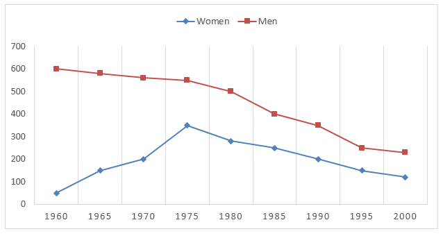 The line graph below gives information about men and women smokers in Bhutan from 1960 to 2000.