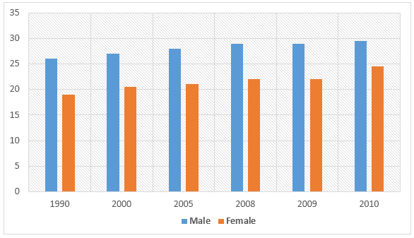 According to the illustration, more than one quarter adult males and one-fifth females were unmarried in 1990. This proportion slightly increased in the next decade when more than 25% male and 21% female were unmarried. The proportion of this single men and women in next five years rose at a higher pace than that of the last decade. Afterwards, the unmarried population in the USA surged more rapidly. Between 2008 and 2010 the ratio significantly increased compared to the previous growth from 1990 to 2005. In just 2 years after 2008, around 30% US males remained unmarried while the proportion of unmarried females was slightly less than that, roughly 24%.