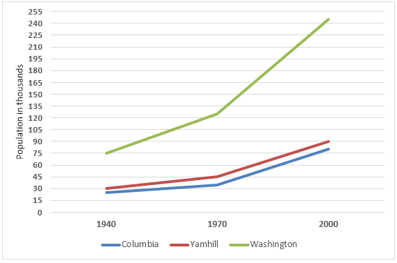 Finally, in 2000, Columbia and Yamhill accommodated roughly 90 and 80 thousand citizens, a noticeable growth than that of the last three decades. In this year, Washington’s population reached to approximately 250 thousand, more than double than that of 1970’s.
