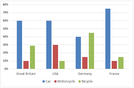 To illustrate, six out of ten British youth favour cars to travel. Less than one-third of them use bicycles and only one of ten youth in the UK pick motorbike to commute. A similar ratio of US adolescents (precise 60%) prefers cars but their preference for motorbikes is higher than that of the UK, 30% to be exact. However, less percentage of American youngsters prefers riding bicycles, only one out of ten. Germany shows an interesting trend where almost half of the adolescents like to ride a bicycle, a trend uncommon in other countries. 40% of them choose cars as their transportation and the rest of them inclined to use motorbikes. Finally, the highest percentage of car-loving youngs are located in France, where around 2 out of 3 adolescent fancy cars over other vehicles. Around 10% of French youth use bicycle and a similar percentage ride on motorized bikes.