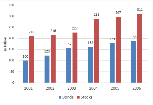 As is presented in the graph, people bought bonds worth 100 billion and more than double than that of stocks in 2001. Next year the investment slightly raised both for bonds and stocks and went further up in 2003. People’s investment in stock went as high as 289 billion in 2004 compared to 162 billion in bonds. The same trend continued in the next two years and in 2006, total investment in stocks by the people of this country amounted over 300 billion, almost a 50% increase than that of 5 years earlier. In this year, people purchased bond worth 188 billion, around 120 billion less than that of stocks and exactly 88 billion more than that of 2001.