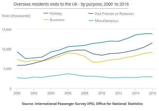 The line graph outlines people’s main purposes to travel to the United Kingdom between 2000 and 2016. As can be seen, enjoying holidays, meeting friends and relatives and business needs were the foremost reasons people from different countries went to the UK during the period and those travellers’ number grew over the time.