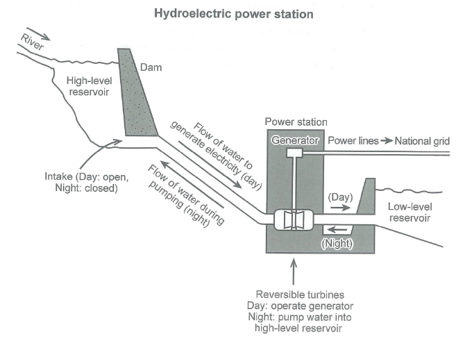 The diagram below shows how electricity is generated in a hydroelectric power station.
